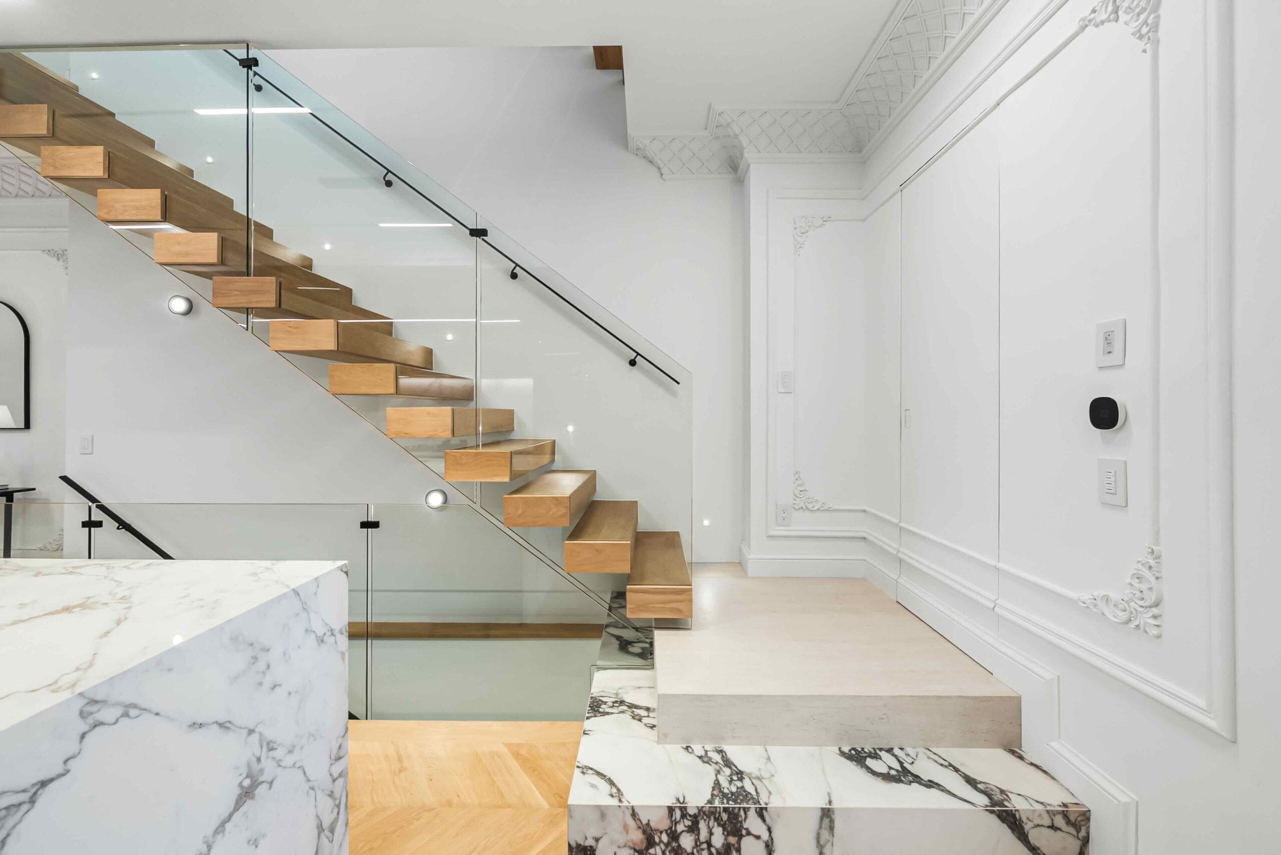 From the moment you step inside, the tone is set. Soaring ceilings, sculptural floating staircases, and hand-finished plaster mouldings create a sense of movement and softness throughout the home. Light pours in through expansive windows, catching on marble fireplaces and custom millwork, giving each space a warmth that feels both elevated and lived-in.