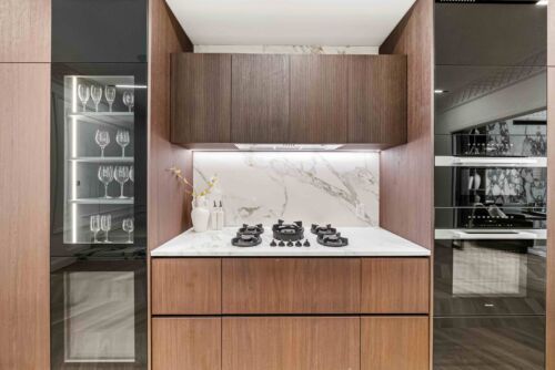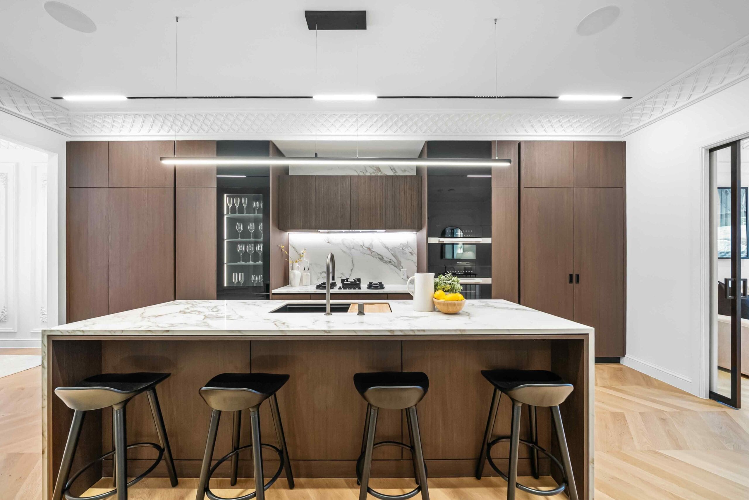 The main level is anchored by a seamless flow between kitchen, dining, and family spaces—designed as much for everyday living as it is for hosting. The kitchen is a statement in restraint and precision, featuring integrated Miele appliances, textured cabinetry, and a generous centre island that invites gathering without overwhelming the space. Just beyond, the family room opens effortlessly to a private, landscaped garden—creating a natural extension of the home during warmer months.