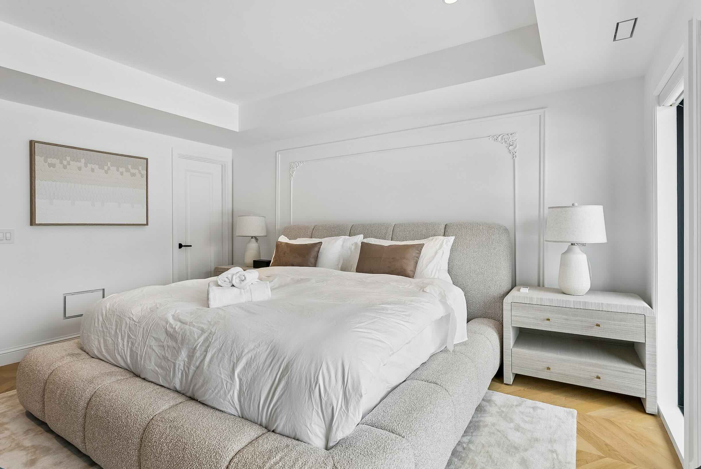 The entire floor is devoted to the primary suite—a retreat that feels both expansive and intimate. A custom dressing room, spa-inspired five-piece ensuite, and a Marquis Bentley fireplace create a sense of calm and permanence, while walk-outs to both front and rear terraces offer uninterrupted views of the Toronto skyline, with the CN Tower quietly anchoring the horizon. It’s a space designed not just for rest, but for perspective.