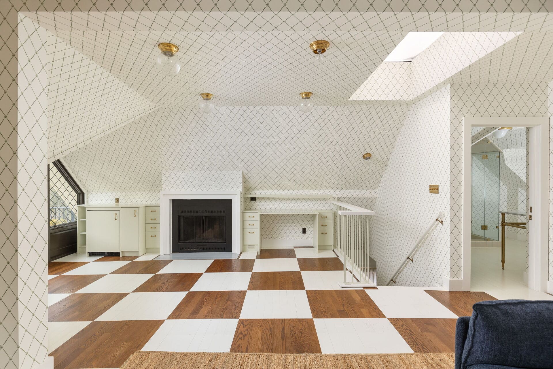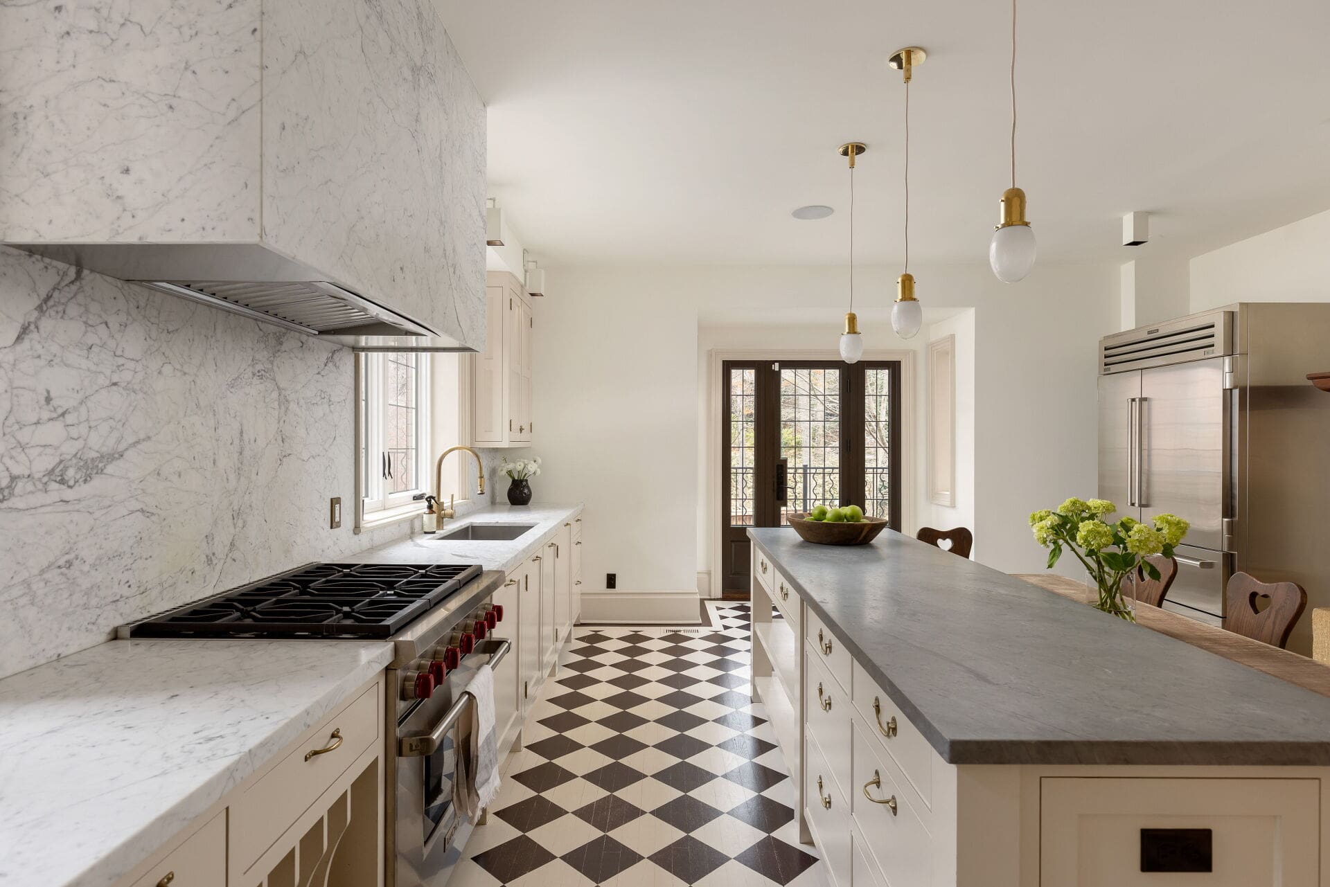 The main level features hand-painted flooring, the kind you don’t see every day—subtle artistry underfoot that speaks volumes about the level of craftsmanship throughout. A wood-burning fireplace anchors the kitchen, one of three throughout the home, giving everyday living a certain cinematic charm. The kitchen itself is a chef’s dream: outfitted with a Wolf range, Sub-Zero refrigeration, an oversized eat-in area, and a walk-out to an expansive deck that feels like an outdoor extension of the living space.