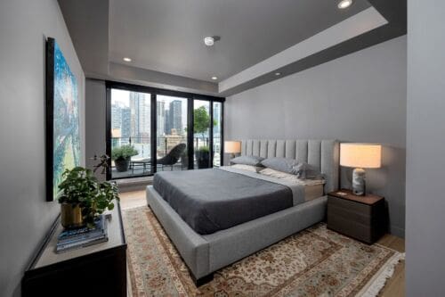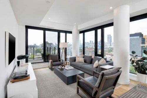 As you step inside, you’ll be greeted by the awe-inspiring northeast views that flood the space through 56 feet of floor-to-ceiling windows. The abundance of natural light creates a warm and inviting ambiance, while the 9′ ceilings, enhanced by additional pot lights throughout, elevate the overall aesthetic.